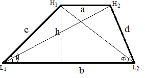 1. 面积 = h(a+b)/2 2. 周长 = a + b + c + d 3. 对角线 L1H2 = sqrt(h2+(b-sqrt(c2-h2))2) 4. 对角线 H1L2 = sqrt(h2+(b-sqrt(d2-h2))2) |